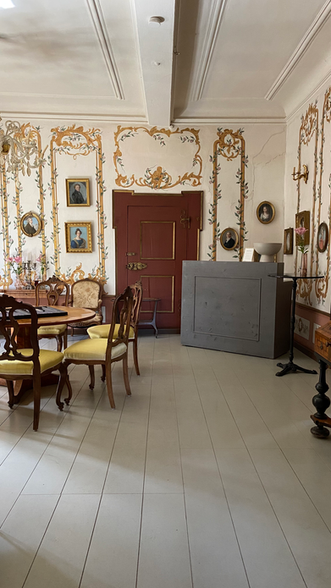 Im nächsten Raum befindet sich die goldene Stube mit Wandmalerei aus dem Barock mit rundem Tagungstisch, diese kann für kleinen freien Trauungen, zur Bar oder Tanzraum umgestellt werden.